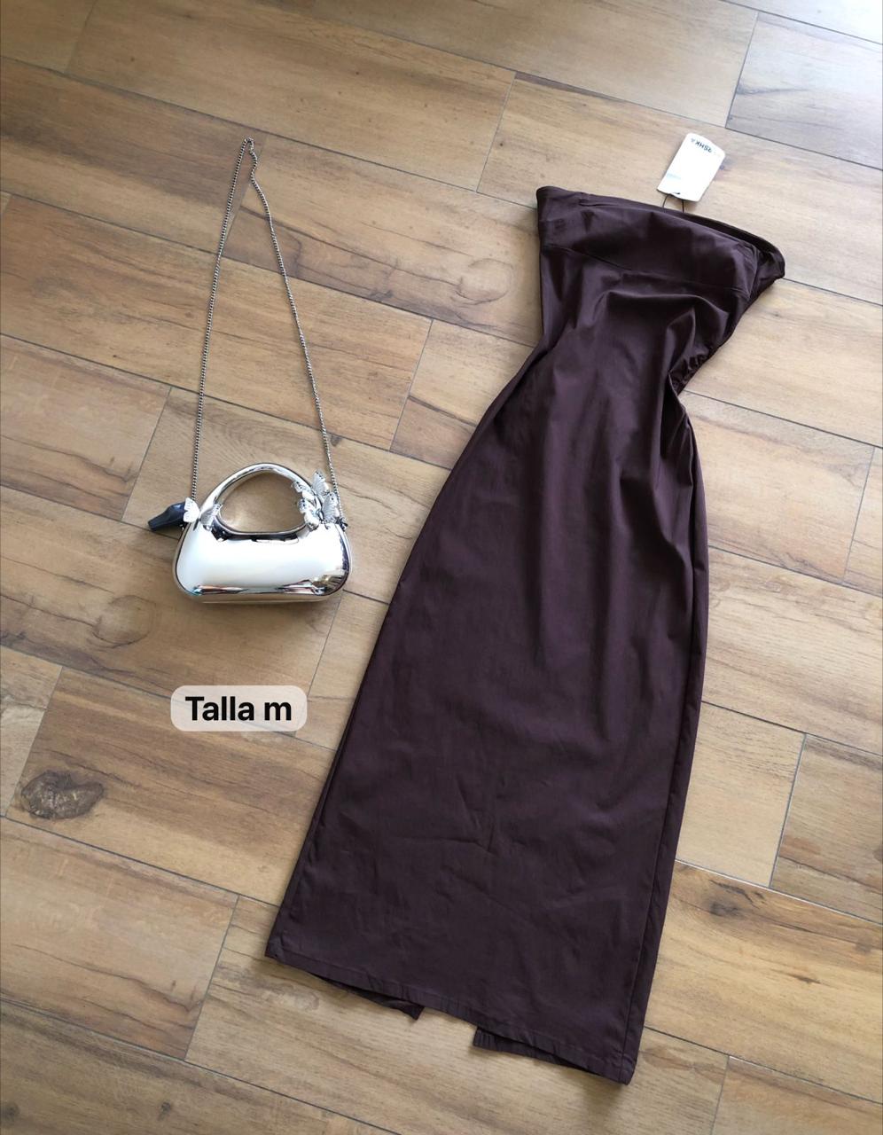Eleva tu estilo con este vestido largo strapless diseñado para impresionar. Su corte de tubo, largo y ajustado, define la silueta con elegancia y sencillez. El sofisticado color chocolate lo convierte en la base perfecta para crear looks memorables.